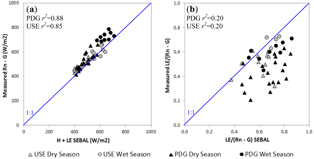 The energy balance closure, given by comparing the turbulent fluxes (H+LE) estimated by SEBAL with the observed available energy (Rn–G), shows an underestimation of about 7% in turbulent flux at the USE site and 9% at PDG, with r2 = 0.88 (p < 0.05) and r2 = 0.85 (p < 0.05) respectively (Figure 3(a)). Since the measurements and estimates of Rn, G, H and LE are found by different methods, the energy balance closure shows whether or not there is agreement between these values. The mean value of H+LE estimated by SEBAL for the USE site was 488 ± 78 W·m−2 whilst the mean of measured Rn–G was 516 ± 68 W·m−2. At PDG, the mean H+LE given by SEBAL was 536 ± 89 W·m−2 compared with a mean of measured Rn–G, 589 ± 109 W·m−2. From an analysis of energy balance closure, Juarez [60] found underestimations of 24% and 23% in observed turbulent fluxes at the sites USE and PDG respectively, suggesting that there may be limitations inherent in the EC measurement system. It is not always possible to reach a satisfactory result because of measurement errors, particularly in the EC technique, which normally underestimates turbulent fluxes because of the difference between the levels at which Rn sensors are mounted (some meters above the surface) compared with sensors for G (some centimeters below the surface), and because of surface heterogeneity [69–71].