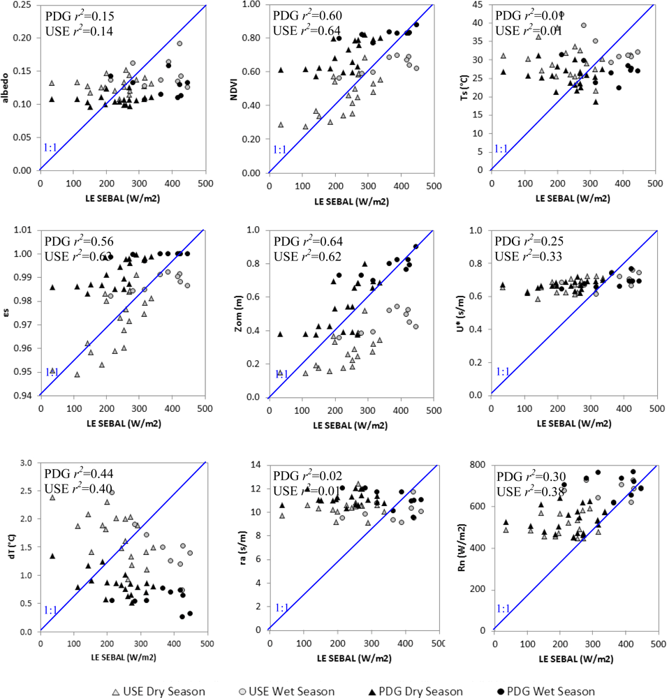 Correlation between inputs and intermediate variables of the SEBAL algorithm and estimated instantaneous latent heat fluxes in areas of savannas (PDG site) and sugarcane croplands (USE site) during dry and wet seasons.