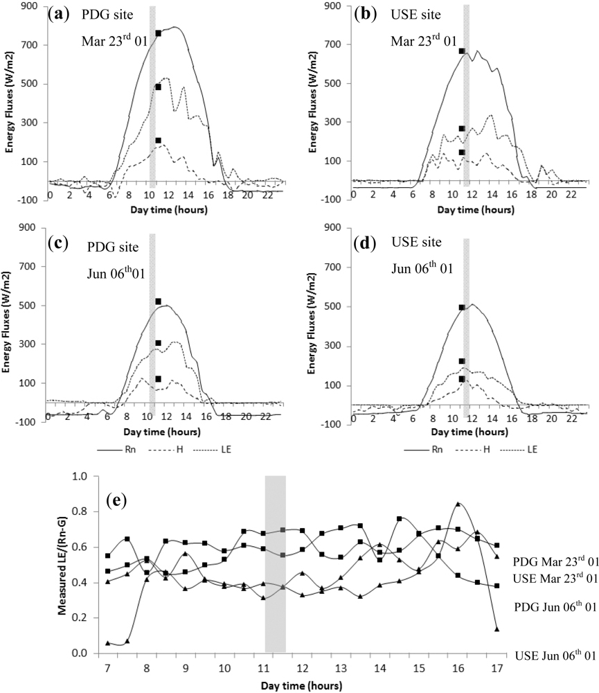 In situ measured energy fluxes (continuous and dotted lines) on 23 March 2001 (end of wet season) at PDG site (a) and USE site (b); and on 6 June 2001 (beginning of dry season) at PDG site (c) and USE site (d). Squares show instantaneous on-overpass (11:30am LT) energy fluxes estimated using SEBAL algorithm. Day-time variability of the evaporative fraction calculated from in situ measured data on those days (e). Shaded bars represent MODIS local overpass (11:30am LT).