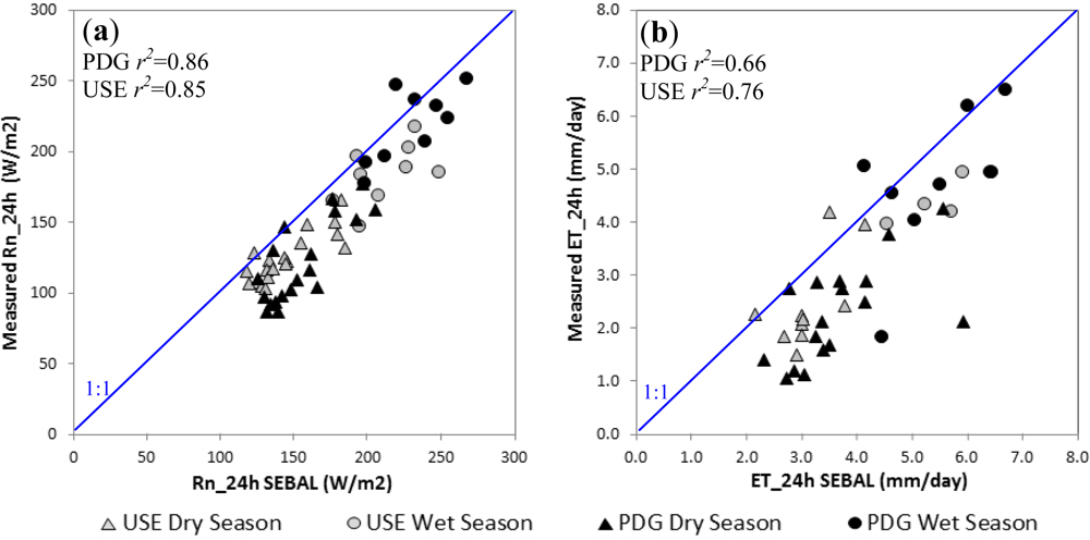 With regard to ET24h derived from SEBAL, estimated values significantly explained between 66% and 76% of the variation of measured data at the USE site (r2 = 0.76, p < 0.05) and at the PDG site (r2 = 0.66, p < 005), respectively. At USE site, estimated ET24h varied between 5.9 mm·day−1 in the wet season and 1.2 mm·day−1 in the dry season, whilst observed values varied from 5.0 mm·day−1 to 1.5 mm·day−1 in the wet and dry seasons. At PDG site, estimated ET varied from 6.6 mm·day−1 in the wet season to 2.3 mm·day−1 in the dry season, with observed values varying from 6.5 mm·day−1 to 1.2 mm·day−1 in wet and dry seasons. Estimated and observed values had similar standard deviations, but ET was overestimated by 0.8 mm·day−1 at USE, and by 1.15 mm·day−1 at PDG, on average, reflecting the overestimation of EF and Rn,24h.