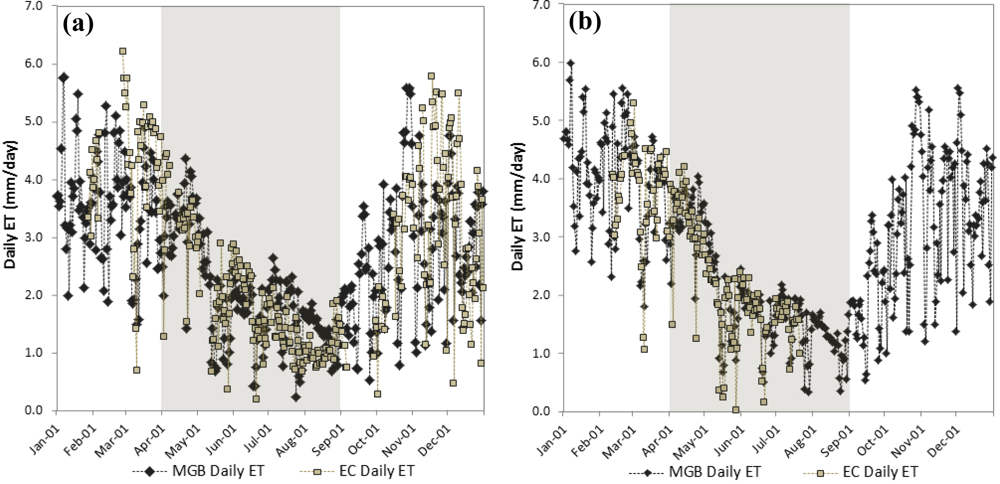 Daily evapotranspiration estimated from the MGB-IPH hydrological model compared with in situ eddy covariance measured data at the PDG site (a) and USE site (b). The climatological dry season is shaded.