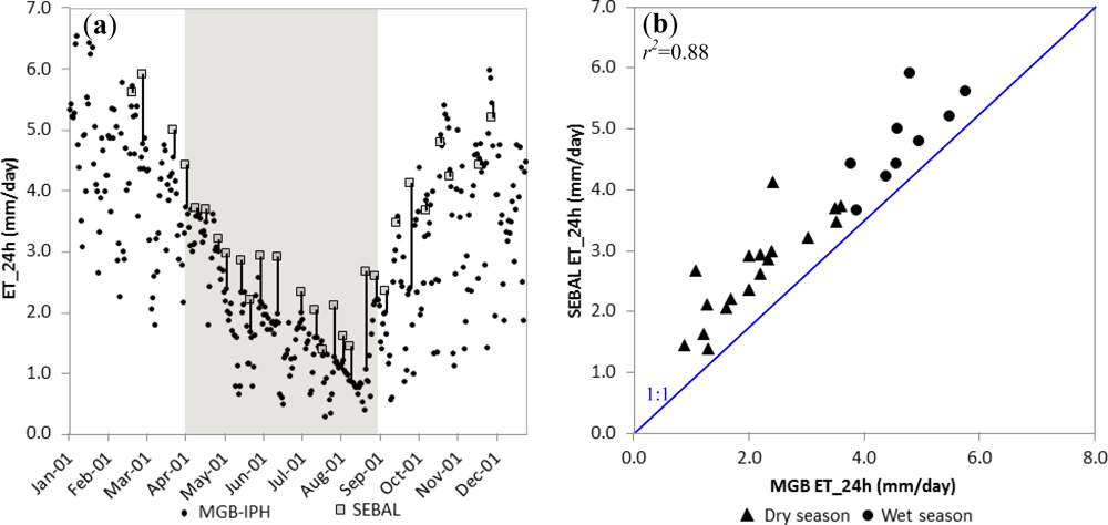 Seasonal variation (a) and correlation (b) between daily evapotranspiration estimated using SEBAL algorithm and hydrological model MGB-IPH for an overlay of 38,100 km2. Bars in (a) are the differences between estimates given by the two models. The climatological dry season is shaded.