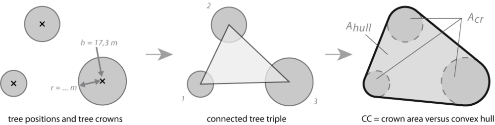 ‘Tree triples’ approach: three trees are connected for calculating the CC. The amount of CC is the relation between the area covered by crowns and the area of their convex hull.