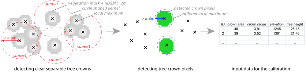 - Clearly separable tree crown samples are automatically extracted from the nDSM to calibrate the function. The main idea is to extract only trees which are located at least 8 m away from any other detected tree. The distance of 8 m is empirically determined for the study areas and represents the largest tree crown diameter found in the study areas. Based on the tree crowns of those filtered trees the function is locally calibrated (Figure 3). The sample trees are detected with a moving window approach, based on a binary raster map of the local maxima. Pixels in the resulting map, where the sum of all pixels within a circular kernel with a radius of 8 m is one, provide positions of trees with a clear, separable crown. The broadest crown diameter is found by applying the NFI calibrated function to the detected local maxima. The positions found are buffered by half of the previously-used kernel size and are intersected with the height thresholded nDSM (nDSM ≥ 2 m) and the vegetation mask. The resulting binary map shows the crown pixels of the identified sample trees. For each tree, the crown area is extracted from the map, and furthermore the average crown radius is derived. Additionally, the tree height and elevation of each sample tree is extracted from the nDSM and the DTM respectively at the position of the corresponding local maximum. For each study area the coefficients of Equation (1) are estimated by solving the system of linear equations based on the crown radii provided, tree heights and elevations of the sample trees. Finally, for each study area the locally calibrated function is applied to derive the crown radii for all trees.