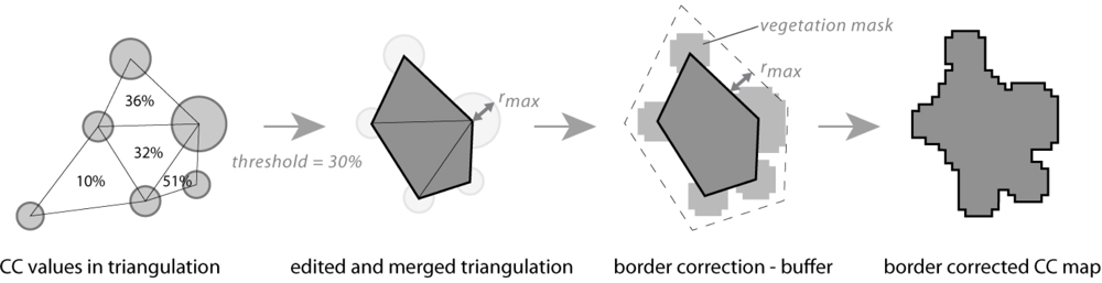 In a next step, the sum of the crown areas Acr of three neighboring trees and the area of their convex hull Ahull is calculated for each tree triple. For this purpose, a tool was implemented in Python [34], which imports a triangulation, calculates the parameters Acr and Ahull and returns the CC value for each tree triple. For overlapping tree crowns within a tree triple, the area of the union of crowns is used for Acr. The derived CC values are assigned to their associated triangles. In a next step, the selected CC threshold of 30% is applied to the triangulation and triangles, which do not fulfill the threshold, are removed. As the exported result is an edited triangulation with triangles fulfilling the CC criterion, the borderlines of the derived map represent the tree stem axes and not the convex hulls of the tree triples (Figure 4). For this reason, a borderline correction is applied by buffering the resulting map by the maximum available crown radius found in the study area. In order to prevent an overestimation of the derived potential forest mask, the buffered area is intersected with the vegetation mask and the resulting areas are added to the valid areas of the edited triangulation. The result of these calculations is a potential forest mask that considers the minimum height criterion as well as the minimum CC criterion.