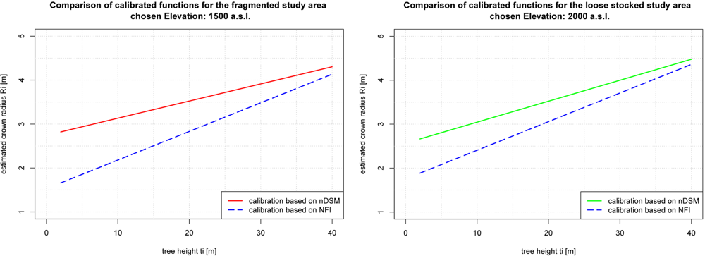 The calibrated functions are plotted in Figure 7 for both study areas. Elevations of 1,500 m a.s.l. and 2,000 m a.s.l. are chosen for the fragmented and loosely stocked study areas respectively for plotting the functions. In contrast to the NFI function, the loosely stocked study area the calibrated function based on the nDSM shows a better agreement than the function for the fragmented study area. The bigger difference of the functions for the fragmented area shows the limitations of a NFI function that was calibrated for a usage at the upper timberline when used in other areas. This also corresponds to the huge underestimation of 25% of the NFI function applied to the fragmented study area. A locally calibrated function can overcome these limitations.