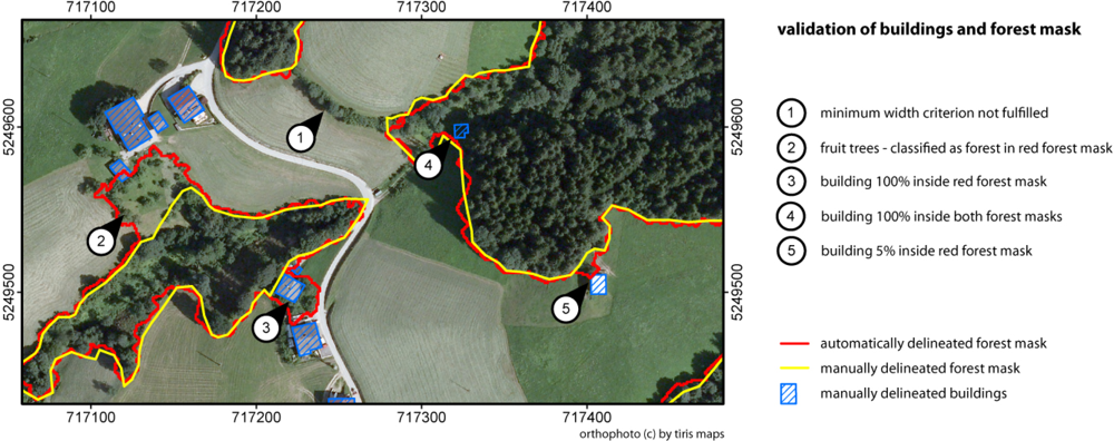 Validation of the automatically delineated forest mask with respect to the footprint areas of buildings covered by the forest mask.