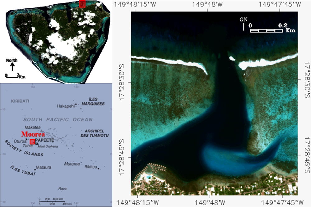 Location of study area on the north shore of Moorea, Society Island archipelago, French Polynesia, and color image of study area. The study area encompassed Irahonu Pass, outer, barrier and fringing reefs and a sand bank.