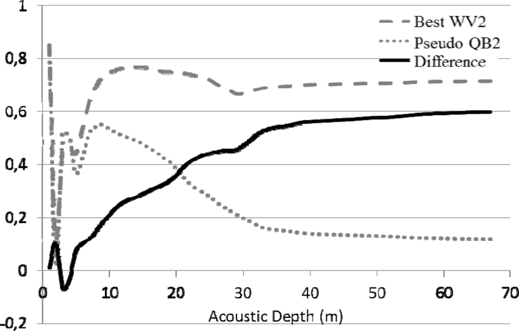 Absolute Pearson product-moment correlation coefficients (r) as a function of water depth as computed between the best WV2 Raod model (composed of the 1267 (purple, blue, NIR1 and NIR2), the 1348 (purple, green, yellow and NIR3) and the 1357 (purple, green, red and NIR2) spectral combinations); the pseudo QB2 Lao model (2357 (blue, green, red and NIR2) spectral combination); and their difference.