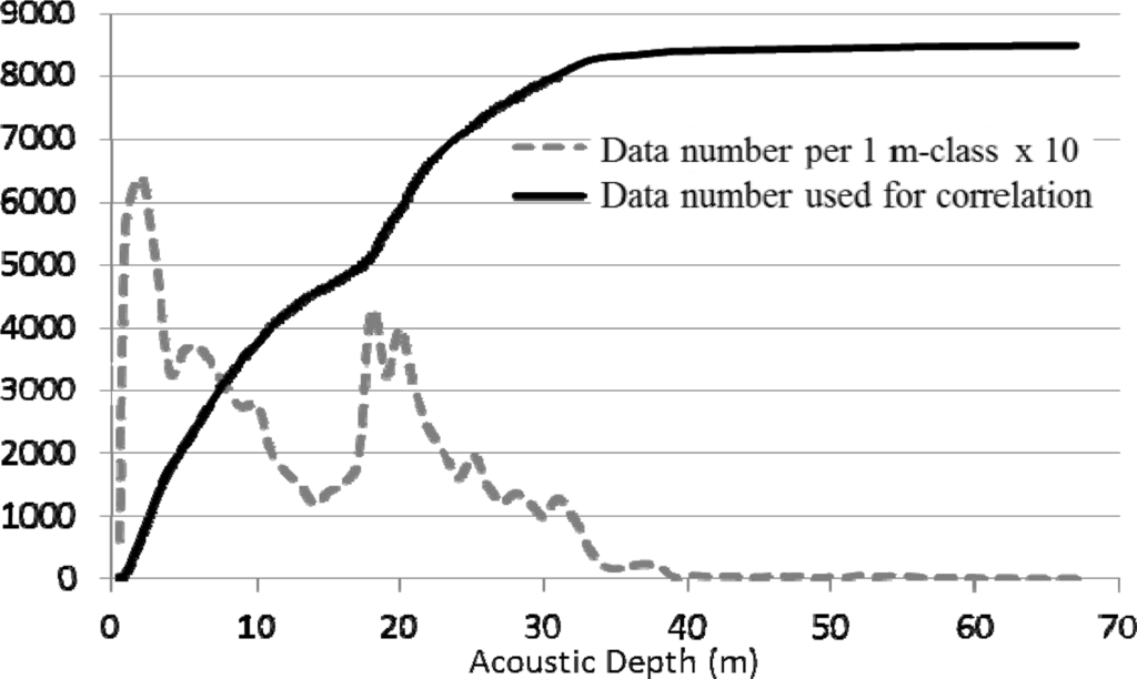 Data points per 1 m-depth class (×10) involved to compute correlation coefficients across the water depth gradient.