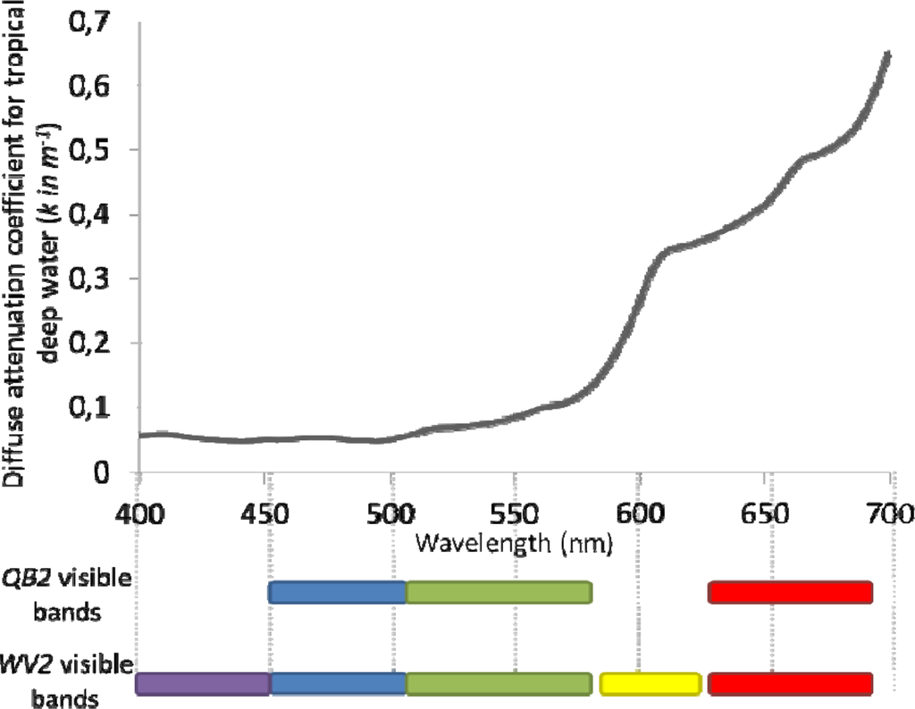 Visible spectral capabilities of the two Very High Resolution Sensors, Quickbird-2 (QB2) and WorldView-2 (WV2), related to the diffuse attenuation coefficient estimated for Moorea’s tropical waters (modified from [18]).