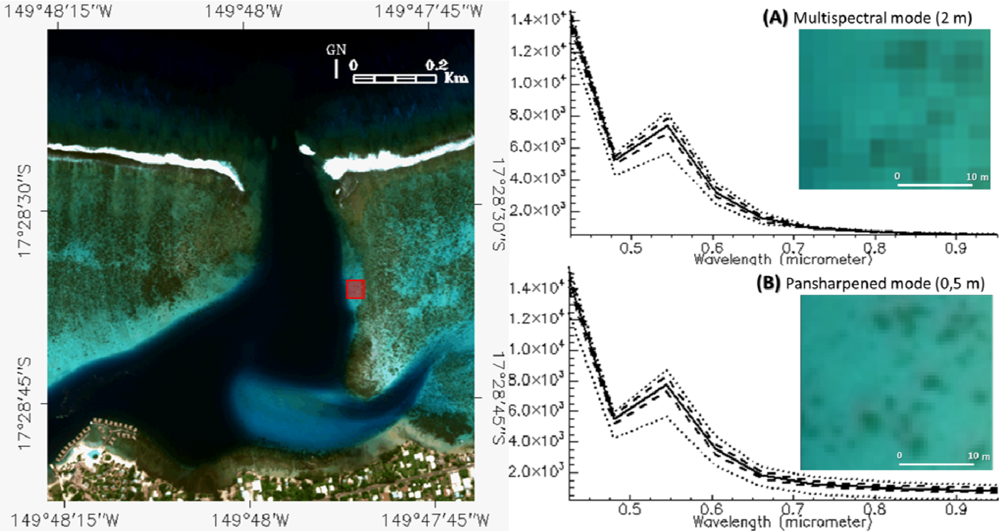Spaceborne multispectral imagery was acquired on 17 March 2010 over Moorea with the WV2 instrument. Launched in October 2009 by DigitalGlobe, WV2 uses an eight band multispectral dataset with a 1.84 m spatial resolution and a panchromatic dataset with 0.46 m spatial resolution when viewing at nadir. Given the off-nadir viewing angle was 19° during the acquisition, the imagery was resampled at 2 and 0.5 m spatial resolution for multispectral and panchromatic datasets, respectively. The dual-sensor can collect a 16.4 km swath up to a 250 km length with 11 bit radiometric resolution. For the sake of comparison, the Quickbird-2 imagery was resampled at 2 and 0.5 m, respectively. Comparing specifications of WV2 and its predecessor in terms of the VHR sensor leader, QB2, allows the technological leap to be quantified. Although the length of the scene was diminished by 100 km, the refinement in spatial resolution (gaining 0.78 and 0.19 m in multispectral and panchromatic modes, respectively) and the doubling of the spectral capabilities (from four to eight) hold great promise to characterize tropical reefscape features at a spatial scale suitable for elucidating reef changes down to the scale of large coral colonies. Of special relevance is the purple band (or “coastal band”) which is expected to provide benthic information at a greater depth than the blue band given its inherently increased water penetration characteristics (Figure 2).