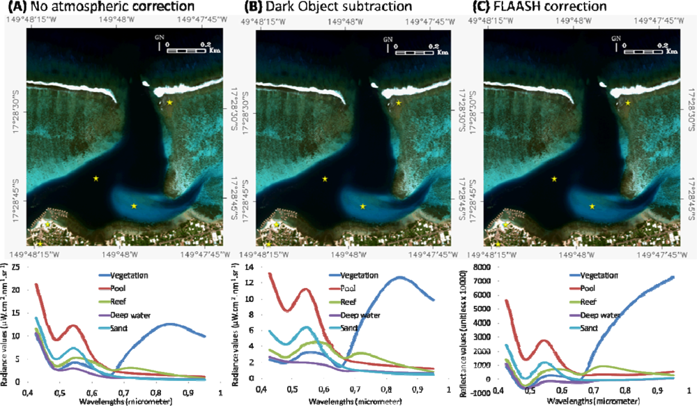 Three modalities regarding the atmospheric correction have been retained: (A) none; (B) empirical Dark object Subtraction (DS); and (C) analytical FLAASH correction. Lower plots represent spectral signatures of five features (golden stars over images) against the three modalities.
