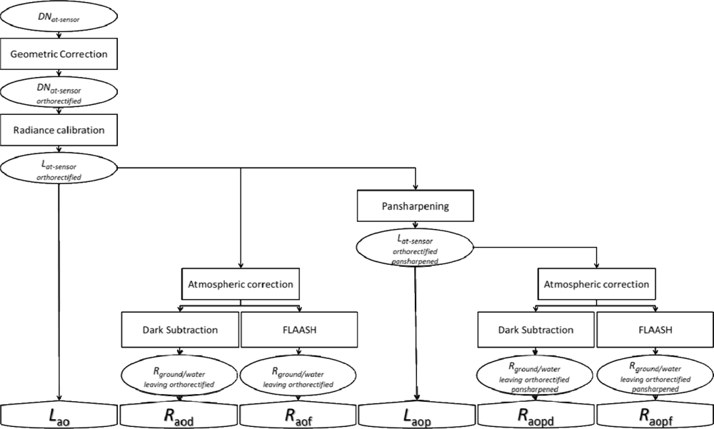 In the current work, we tested the influence of the atmospheric correction on the bathymetry retrieval. Three modalities were retained: no atmospheric correction, dark object subtraction as the one-way correction, and rigorous two-way correction with the MODTRAN4-driven FLAASH algorithm (Figure 4). Taking into account the impact of how pansharpening was analyzed, our protocol spans six datasets (Figure 5).