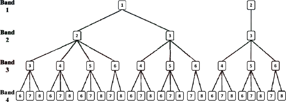 The novelty of the spectral capabilities of WV2 imagery was fully exploited in testing of all possible combinations as datasets intended for bathymetry retrieval. The ratio transform algorithm integrated four wavebands displaying four various diffuse water attenuation coefficients, sorted from the smallest to largest. Some constraints were applied when building the spectral datasets. Given the decreasing difference between coefficients, the first band, among the four encompassed in the spectral combination, was either purple or blue WV2 wavebands; the second band was either blue or green; the third band comprised green, yellow, red and NIR1 (very near-infrared), while the fourth and last band encompassed WV2 wavebands ≥725 nm (i.e., near-infrared). For each of the modalities of spatial resolution (measured 2 m and pansharpened 0.5 m) and atmospheric correction (none, empirical dark object subtraction and analytical FLAASH correction), an array of 27 band combinations was subject to the bathymetry retrieval procedure. The spectral combinations can be illustrated with a flowchart (Figure 6). A total of 162 (=27 × 6) DRDM were thereby carried out to be tested against the in situ bathymetry measurements.
