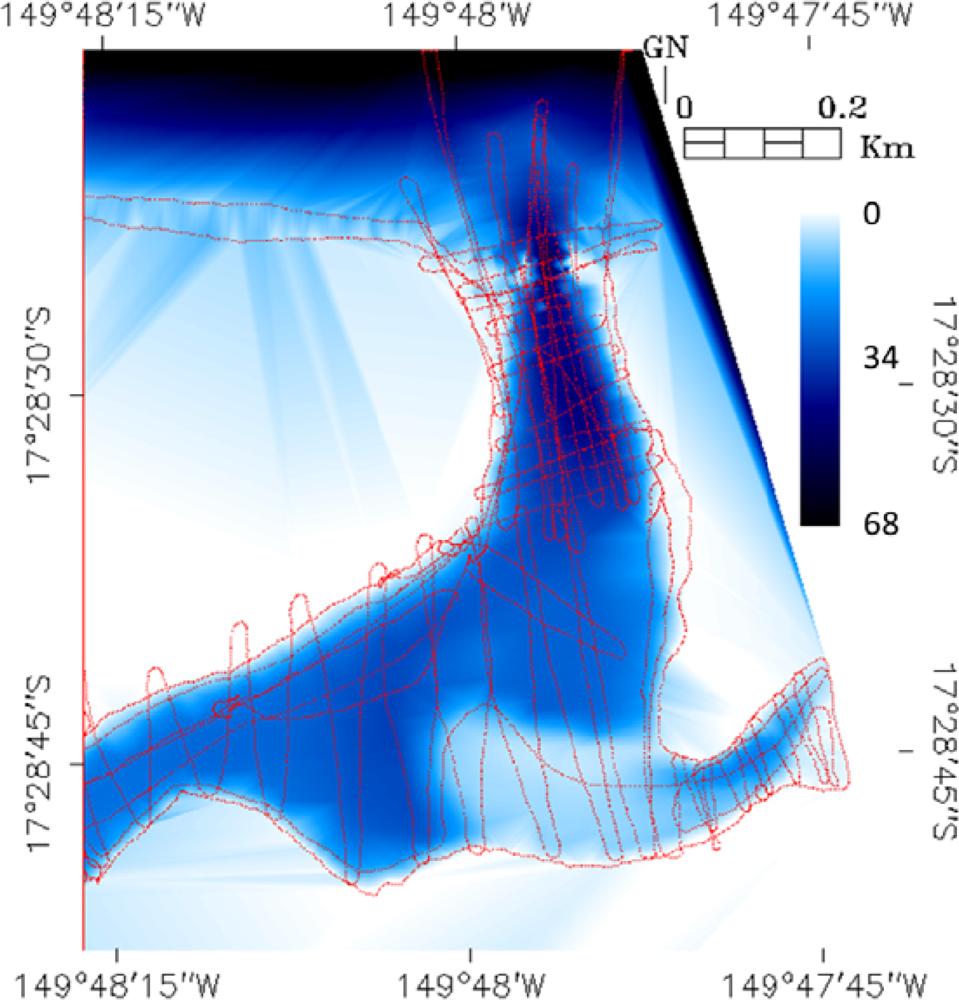 The robustness of the DRDM was defined using an acoustic survey that was conducted during 4–18 January 2011 over the study area. Depth measurements were made from a small boat equipped with a dual frequency (50/200 kHz) digital sonar and 12 channel GPS receiver (Garmin GPSMAP 546 s). Data were recorded at 0.5 Hz to a laptop as NMEA text strings. The boat made transects across the study region (Figure 7) at a nominal speed of 1 m/s, spanning the full range of depths and substrate types. Water column measurement accuracy was estimated to be <0.2 m.