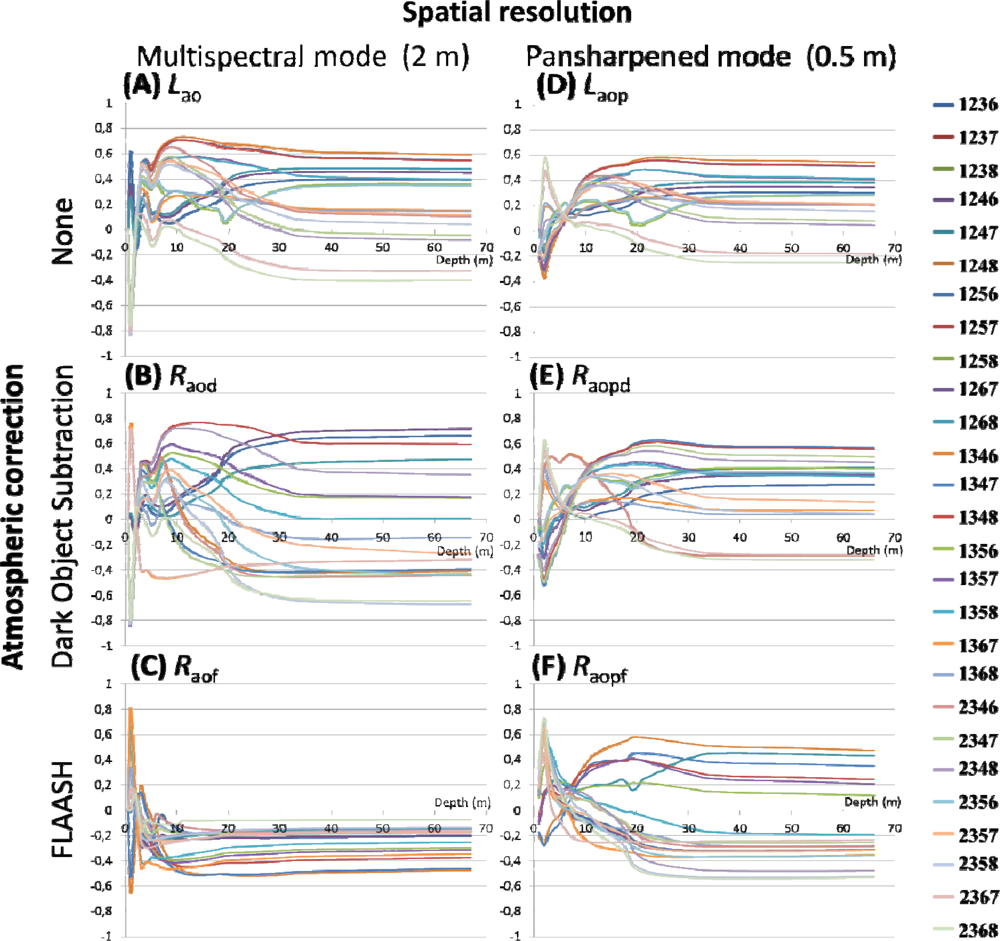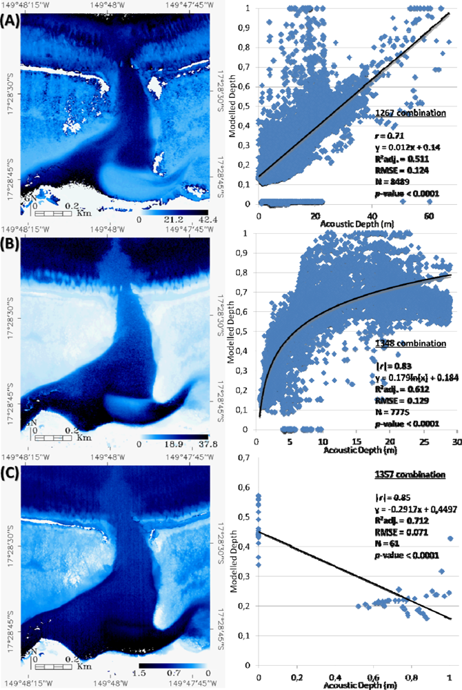 Searching for the modality yielding the most efficient bathymetry retrieval, we used the best spectral combinations within the Raod modality, i.e., the original 2 m with a dark object subtraction by way of atmospheric correction. Topping the correlation curves, three spectral combinations succeeded one another across the water depth gradient (Figure 8(B)).