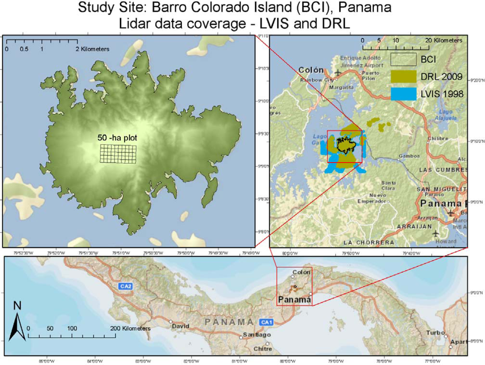 Study Site: Barro Colorado Island (BCI) and the 50-ha Forest Dynamics Plot (top-left) and the discrete-return lidar (DRL) derived hillshade model to show relief, regional lidar data coverage (top-right), Republic of Panama (bottom).