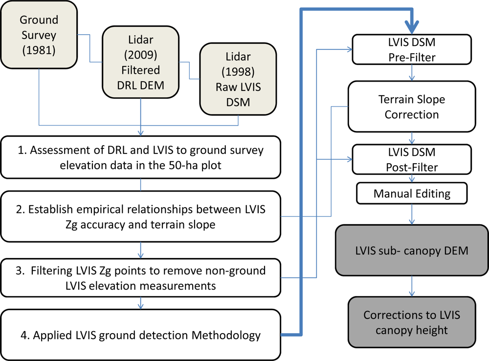 We introduce a new LFL processing methodology based on the comparison of LFL and DRL to improve the sub-canopy DEM derived from LFL Zg last-return data. First, we assess the accuracy of the DRL DEM and LFL Zg digital-surface model (DSM) compared to the 50-ha plot ground survey elevation data. We also test the DRL DEM against Differential GPS (DGPS) and radio-corrected GPS control points. When we refer to the DSM, we imply that it is the unfiltered, unadjusted LVIS Zg surface model. Once processing occurs, non-ground points are removed from the sub-canopy DSM and we refer to it as a DEM, which implies some level of post-processing and an improvement on the original LVIS DSM. Secondly, we analyze the relationship between terrain slope and LFL Zg accuracy to establish empirical relationships which will be used to correct LFL Zg elevations. Third, we analyze topographic anomalies in the LFL DSM and create LFL Zg filters which are capable of removing some of the extreme outliers from the LFL sub-canopy DEM. Lastly, we test a new applied LFL processing methodology which applies both filtering and slope correction methods to create an improved LFL DEM. The new methodology has four distinct steps to improve LFL ground detection, which draw from the initial analysis (Figure 2). The first is to pre-filer the LFL DSM to remove all extreme outliers and generate a preliminary DEM, the second uses the preliminary DEM to apply vertical corrections based on approximate slope to the original LFL Zg points. The third is to re-apply the filters to the slope adjusted LFL Zg points to produce a filtered and slope corrected DEM. The final step is a manual editing process to remove LFL Zg values which were not removed by the filters but appear visually anomalous. The end result is an improved LFL DEM and associated corrections to LFL canopy heights. The approach is designed to be applied over regions where DRL data is not available.
