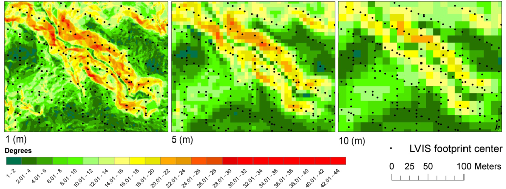 Map of DRL–derived slope on BCI at three spatial resolutions, 1 m (left), 5 m (center), 10 m (right). LFL laser pulse center points are displayed on slope map to display the variation in terrain at different spatial resolutions.