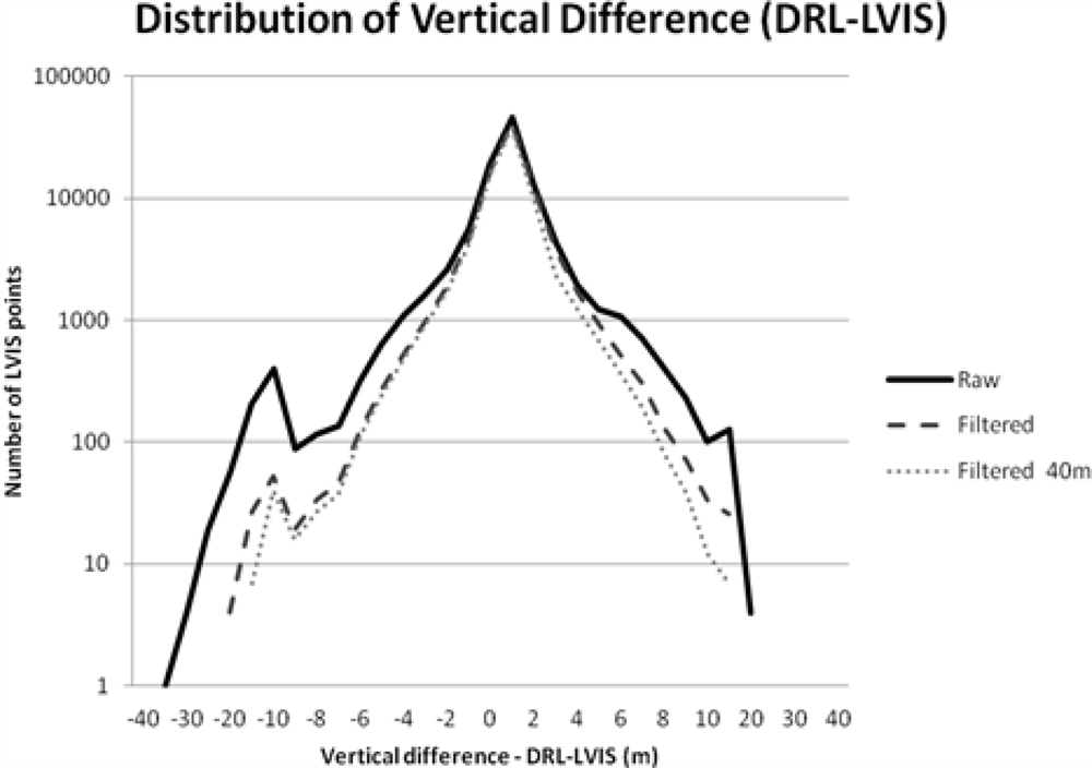 After the verification of the DRL DEM, we perform the statistical assessment of LFL Zg elevation and the associated DRL bare-earth DEM. By viewing both DRL and LFL points simultaneously, the DRL control surface can be used to determine the best possible estimate of LFL accuracy under dense tropical vegetation. In this section, the DRL DEM is the Triangulated Irregular Network (TIN) bare-earth surface created from filtered and manually edited DRL last-return data. For the purpose of our study, it is considered the true surface DEM. The difference between the control DRL DEM surface and LFL DSM provide an assessment of the canopy penetration capabilities of LFL (Figure 2). The vertical differences between the LFL Zg elevation and the DRL DEM are determined by using the ‘run control report’ function in Terrascan. This function is generally used to calculate vertical accuracy of DRL DEMs from ground based control points. The LFL Zg elevation is compared to the TIN surface created by the three nearest DRL points, using three specific parameters. The maximum size of the triangle is the first parameter, which was set at 20 m, the maximum slope allowed in the triangle was set to 90 degrees and the third parameter z-tolerance was not used due to the large triangle size. The control report output calculates the vertical difference by subtracting the LFL Zg elevation from the elevation of the TIN surface of the three nearest neighbors of the DRL DEM. All results will be presented in this manner, with vertical differences being DRL TIN surface minus the center of the LFL footprint. Negative values indicate an LFL point which is above the ground surface and positive values indicate a LFL Zg elevation below the DRL DEM surface.