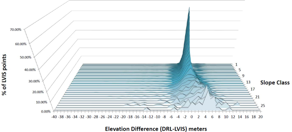 Average vertical difference (x-axis) between LFL and DRL DEM (m), as a function of terrain slope by relative percentage of LFL points in each slope class. Negative vertical difference values indicate LFL points are higher than DRL DEM, i.e., DRL – LFL = vertical difference. Percentage of LFL points in each slope class (y-axis.) Flat terrain is represented at the back of the chart and increasing in steepness towards the front (z-axis). Each slope class is a 2 degree interval. Examined at 1 m pixel resolution.