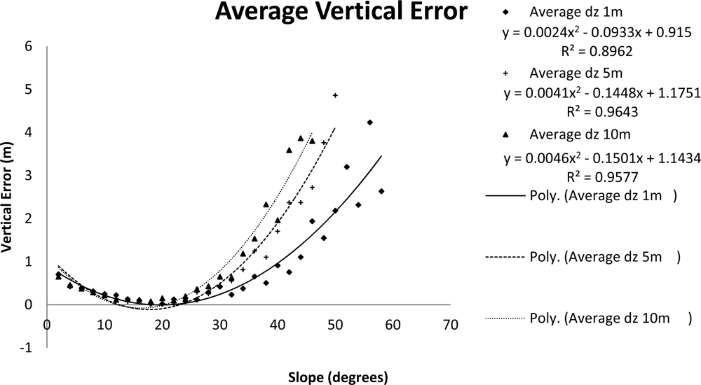 Average Vertical Error between LFL and DRL derived DEMs, as a function of terrain slope. Difference in vertical elevation (dz) between DRL DEM and LFL Zg., examined at three pixel sizes (1 m, 5 m, 10 m).