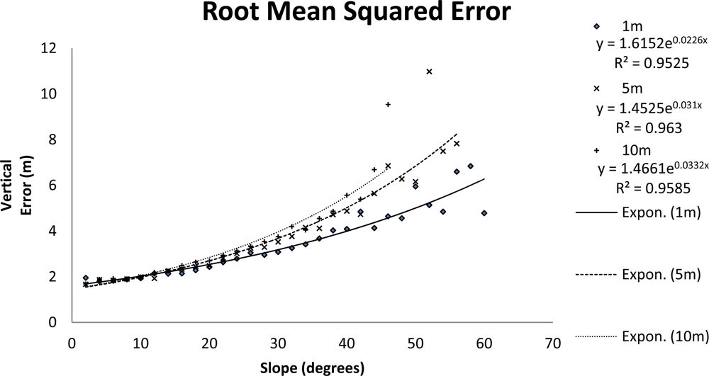 Root Mean Squared Error between LFL and DRL derived DEMs, as a function of terrain slope, examined at three pixel sizes (1 m, 5 m, 10 m).