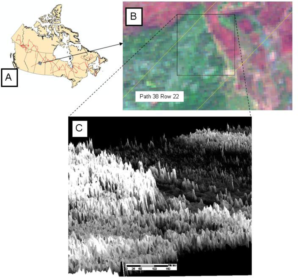 Context and example of a LIDAR transect at the boundary of a burned area. A. Overview of entire 2010 LIDAR campaign over the Canadian Boreal forest denoted in red. B. Sub-scene from Landsat-5 Path 38 Row 22 October 2003 RGB image of bands (5,4,3) with generalized LIDAR transect outline in yellow and the 2002 wildfire scar identified by the pixels with shades of pink. C. Three dimensional surface view of a 0.5 m LIDAR Canopy Height Model with the wildfire impact illustrated, boundary evident and unburned islands also evident. The sub-scene is located in Saskatchewan and is centered at 54°50′30″N, 107°7′0″W.