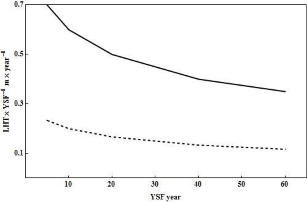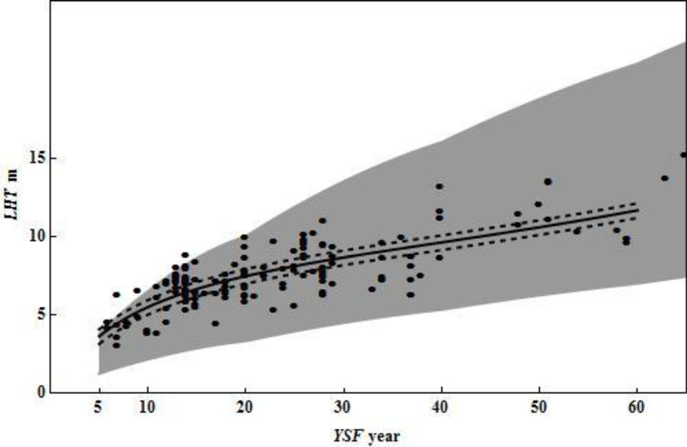 A summary of the 154 estimates of post-fire regenerated canopy heights is presented in Figure 8. A forward-stepwise regression analysis [60] with LH̄Tin × YSF−1 as the dependent variable and YSF, latitude (LAT), longitude, number of growing degree days, average daily maximum temperature (May-August) as explanatory variables identified YSF and LAT, as the only significant explanatory variables. Squared and square-root transformation of all explanatory variables were included in the stepwise screening which used a entry level of significance of 0.02, and a retention level of significance of 0.05 [61]. The model identified by the stepwise screening and re-transformed to a polynomial of LHTin in YSF is in Figure 8 (adjusted coefficient of determination = 0.63; residual standard error = 1.31 m).