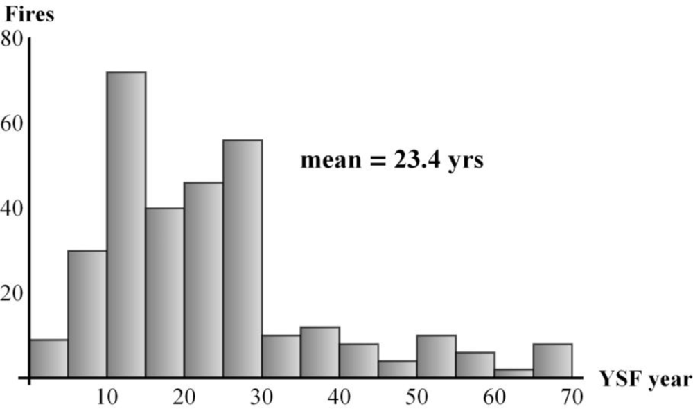 The years since fire (YSF) distribution in the study areas varied from 3 years to 68 years with a mean of 23 years (median 20 years) and a mode at 14 years (9%). Figure 4 illustrates the YSF distribution. Cases with an YSF-value of less than 5 years were not subject to analysis since the young age prevents us from discriminating between pre- and post-fire tree populations. Also, the distribution of YSF cannot be interpreted in terms of fire frequencies and fire cycles [54,55] due to incomplete records for fires prior to 1990 [42] generally coinciding with the advent of satellite remote sensing and the systematic, synoptic, mapping of large fires.