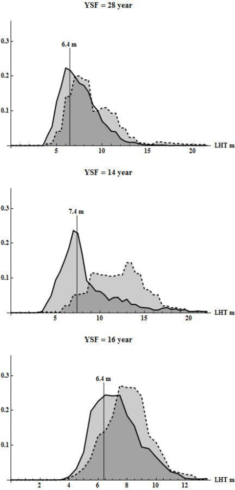 Three randomly selected examples of probability distributions (34) of LHTin (full outline) classified as a post-fire canopy (Table 1, Step 1). The distribution of LHTout is indicated (dashed outline).