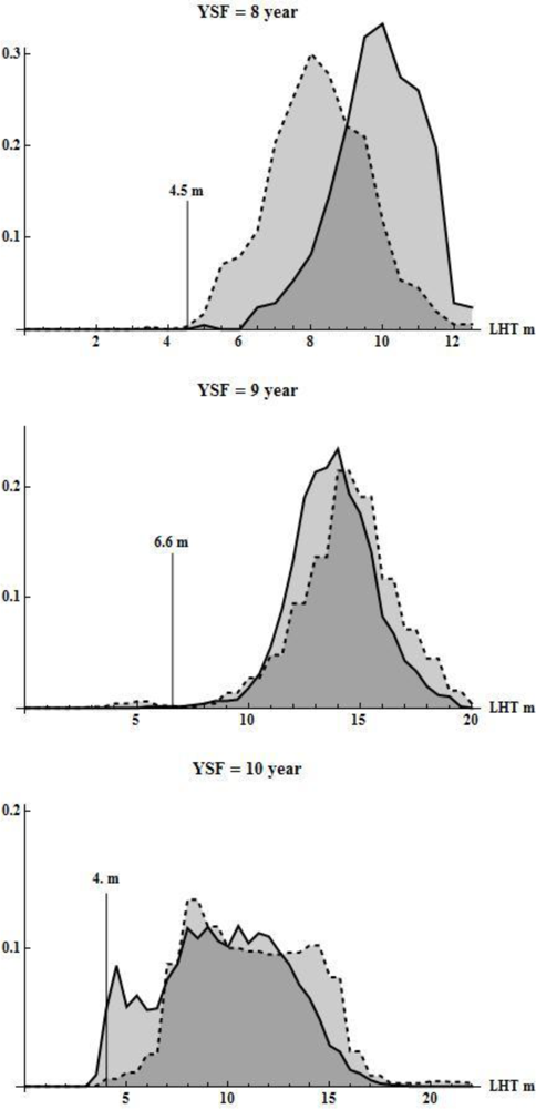 As seen from Tables 1 and 2, in 32 cases we classified the observed distribution of LHTin to the pre-fire canopy category. An attempt to identify patches of post-fire regeneration by comparing Google Earth™ imagery to spatial k-means clusters of LHTin was unsuccessful (k ≤ 6). Since we could not repudiate that the left tail of f̂in,i(lht) contains elements of a post-fire recovering canopy, we assigned each case a default average annual post-fire canopy height growth rate equal to 0.5LĤTQ95 × YSF−1.