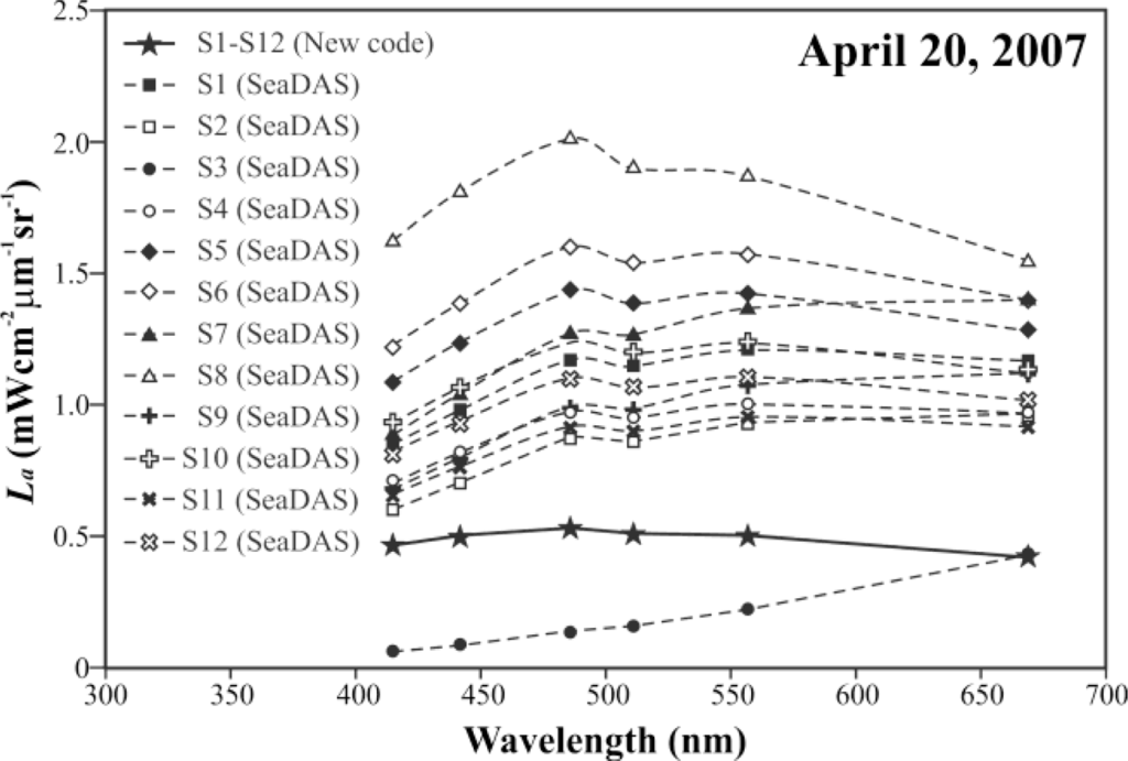 Comparison of aerosol radiance (La) calculated by the new code and SeaDAS at the 12 sites in Lac des Allemands for the OCM data of 20 April 2007.