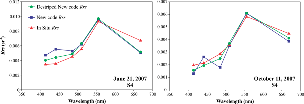 Due to variations in relative response of the individual detectors on the CCD array, OCM radiance images sometimes have along-track stripes especially obvious in OCM bands 1, 2, and 3 [36]. Figure 11 shows the comparison of Rrs obtained from in situ measurements and Rrs estimated by the new code before and after destriping for 21 June and 11 October 2007 at a central lake site. Clearly, destriping improved the Rrs spectra and reduced the abnormalities in the blue bands. The destriping smoothed out the noise from bad detectors and the destriped OCM Rrs spectra matched closely with the in situ radiometer spectra. The high closure between the radiometer Rrs and the new code Rrs demonstrated the effectiveness of the procedures developed in this study.