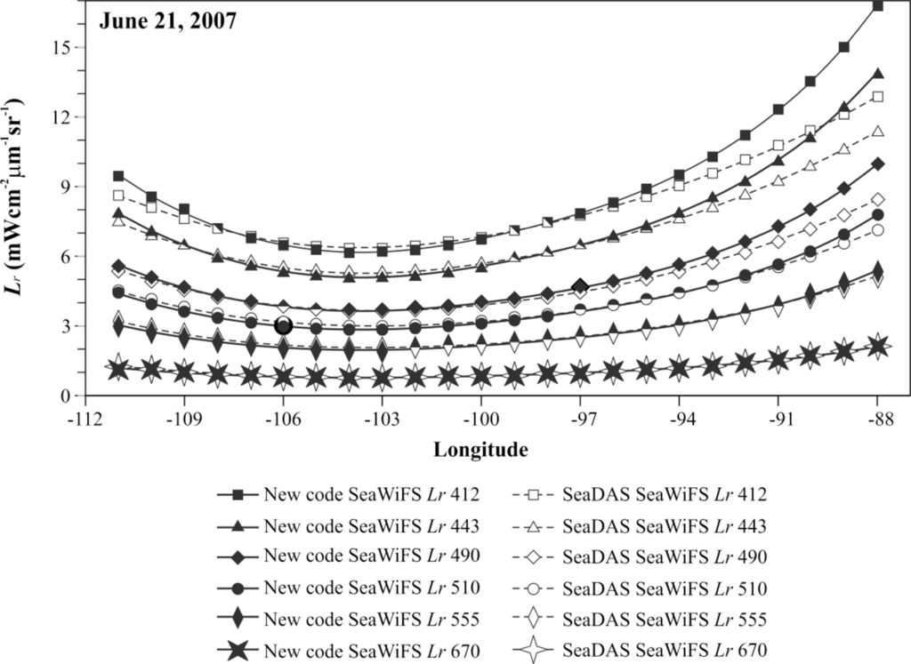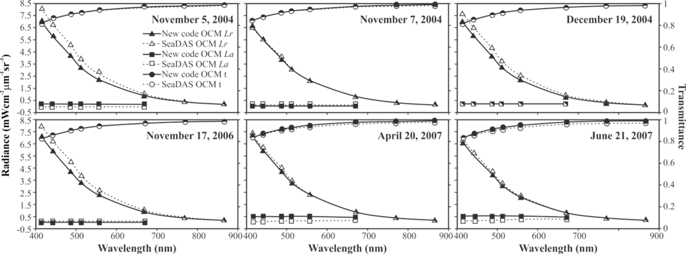Figure 6 shows the comparison of Rayleigh radiance, aerosol radiance and diffuse transmittance calculated by the new code and SeaDAS over the atmospheric correction sites for the OCM data. Lr computed by the new code and SeaDAS were in good agreement for the dates 7 November 2004, 20 April 2007 and 21 June 2007. Since Rayleigh scattering depends on solar and viewing geometries and the location of the observation site within the scene, the differences were greater between the new code and SeaDAS computed on 5 November 2004, 19 December 2004 and 17 November 2006. The new Lr code derived diffuse transmittance and aerosol radiance values for all the sites and dates were in agreement with the SeaDAS calculations (Figure 6).