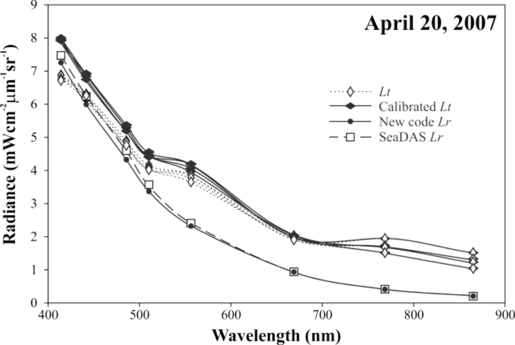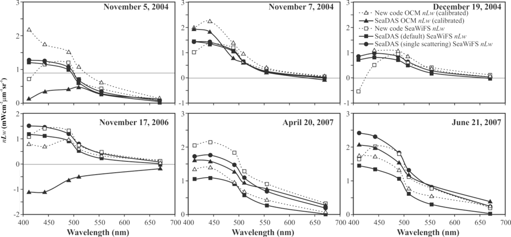 Figure 8 shows the comparisons between the new code and SeaDAS processed SeaWiFS, and vicariously calibrated OCM nLw spectra. The spectral shapes of SeaDAS processed SeaWiFS (with the default multi-scattering and the single scattering approaches) were similar with a slight difference in magnitude. The new code processed SeaWiFS nLw values were in good agreements with SeaDAS processed SeaWiFS nLw values, however, a difference was observed in the first few bands. This is because the SeaWiFS data were not vicariously calibrated when processed through the new code. In SeaDAS, the SeaWiFS vicarious calibration coefficients of the corresponding dates are usually applied prior to atmospheric correction using look-up-tables within SeaDAS. If the SeaWiFS data are not processed through SeaDAS, the vicarious calibration coefficients are not being applied automatically and differences in radiance values would be observed. From Figure 8, it is clear that the blue SeaWiFS bands were most affected by these calibration errors. Hu et al. [11] also found significantly lower water-leaving radiances in SeaWiFS bands 1 and 2 while processing SeaWiFS data through their modified atmospheric correction procedure. They also attributed this to incorrect calibrations in the SeaWiFS bands 1 and 2.
