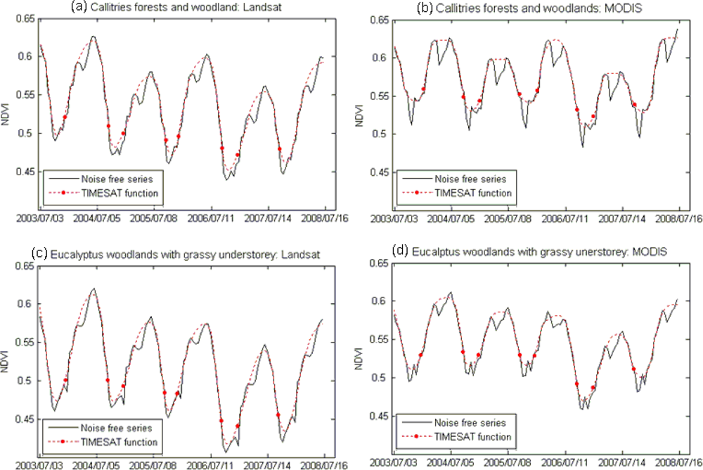 Extraction of seasonal parameters from Landsat TM and MODIS NDVI time series using the TIMESAT program. (a) and (b) Callitris forests and woodlands; (c) and (d) Eucalyptus woodlands with grassy understorey. The polynomials were fitted in noise free NDVI series using the Logistic function available in TIMESAT. The dots in the fitted polynomials indicate the start and end points of respective seasons.