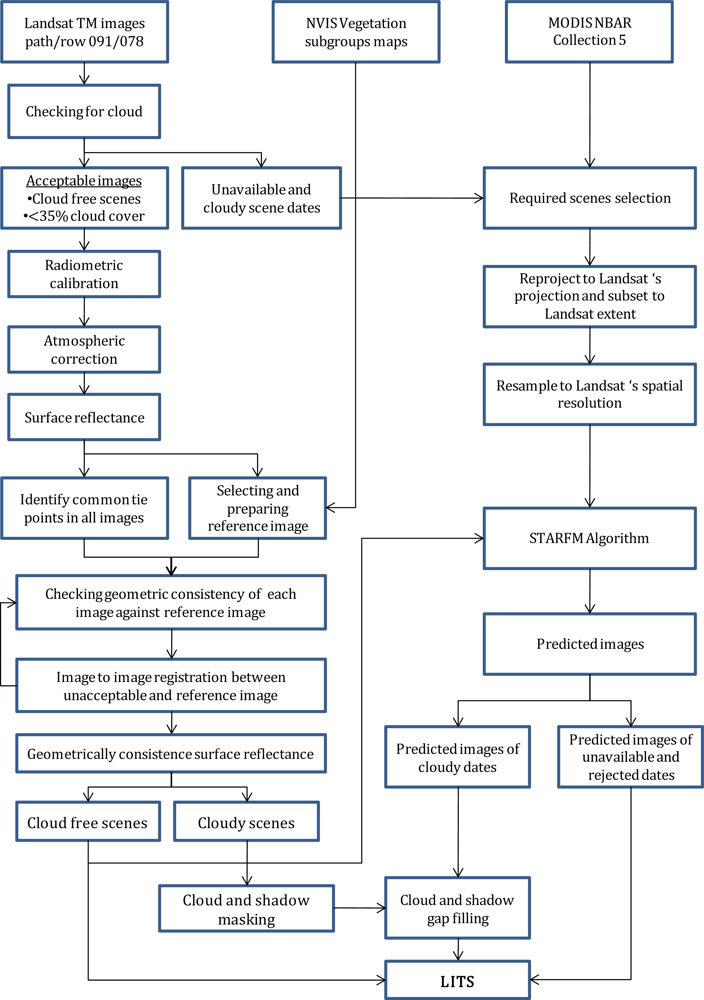 The method outlined in this paper can be used to develop Landsat Image Time Series (LITS), a relatively long, dense and regular (in time) sequence of Landsat TM/ETM+ images, suitable to be analyzed by means of time series analysis techniques, to monitor and measure seasonality and trends in the structural and physiological properties of vegetation. The STARFM algorithm performed equally well to predict the synthetic Landsat TM images in a eucalyptus dominated forest and woodlands environment compared to coniferous environments reported by earlier studies. The MODIS NBAR data set is a viable alternative to the MODIS daily and 8-day composite reflectance used in similar studies, for input to the STARFM algorithm. Moreover, the accuracy of FPC values derived from STARFM predicted images indicated that the information could also be accurate at the Landsat TM spatial scale. Future studies with sufficient ground-measured phenological data at the Landsat TM spatial scale will be required to strengthen this conclusion. The method, however, required considerable human machine interaction for the cloud and cloud shadow masking and to make sure that all images in LITS are well registered each other, it could not be fully automated.