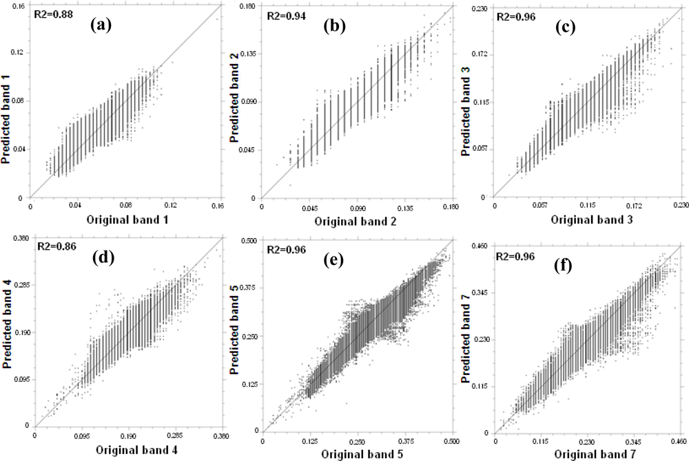 Table 3 shows the description of three predicted Landsat TM images used for assessing the prediction accuracy of the STARFM algorithm. The prediction dates were chosen so that the original Landsat TM images for all three dates as well as all other required input images were cloud free and good quality. Figure 4(a–f) shows per-pixel comparison of reflectance from all six reflective bands of the original Landsat TM image of 2006/06/25 and the predicted image. It shows the fit of scatter plots to the 1:1 line and the coefficient of determination (R2) values.