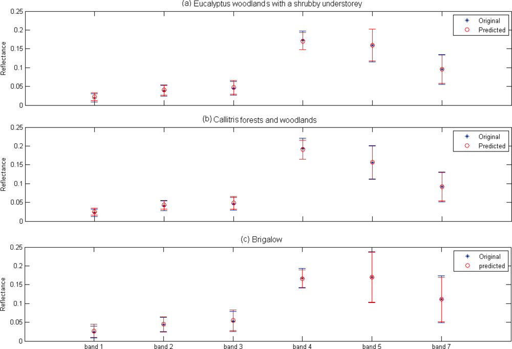 Mean and standard deviation of the Landsat TM spectral band reflectance values for original and predicted Landsat TM image of 2006/06/25 in (a) Eucalyptus woodlands with shrubby understory (b) Callitris forests and woodlands and (c) Brigalow. Similar results were found across all vegetation communities and these three were presented as an example