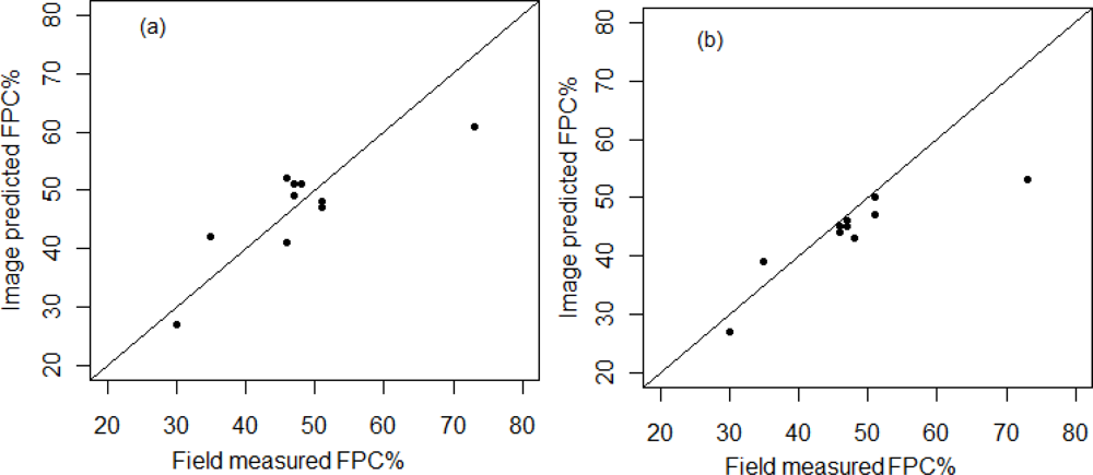 Comparison of predicted Landsat TM image derived foliage projective cover (FPC) of: (a) 2005/07/08; and (b) 2005/07/24 with field measured FPC from 2005/07/11–13.