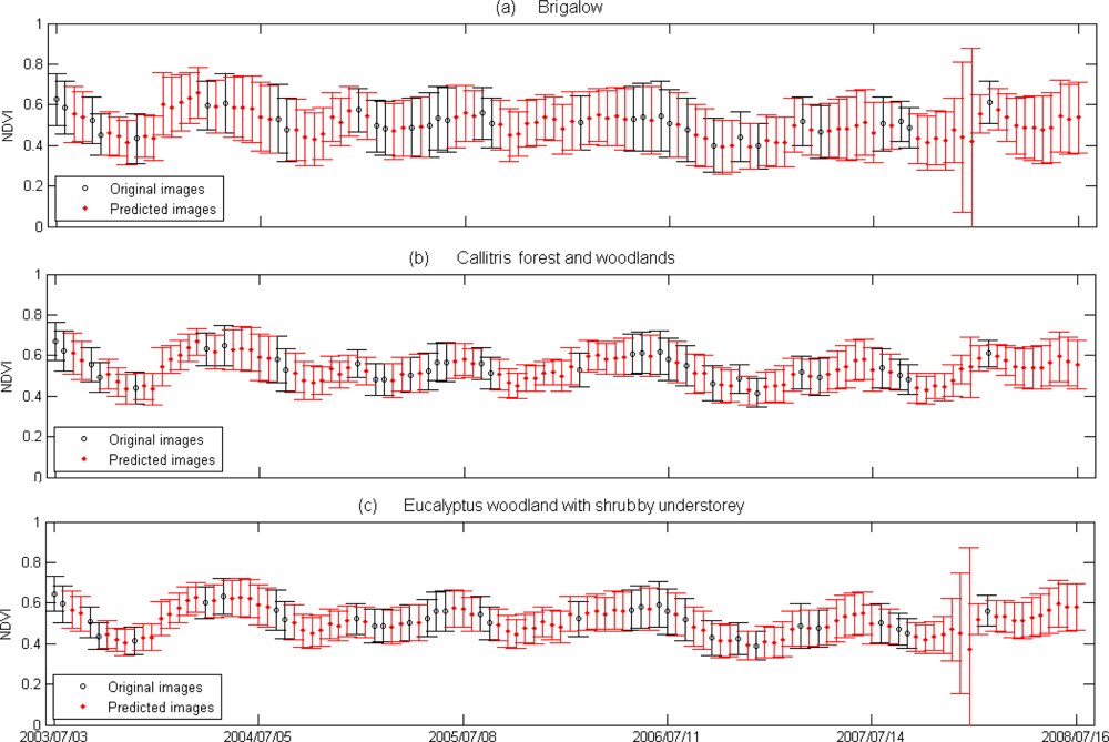The pattern of means and standard deviations of predicted and original images (Figure 8(a–c)) indicated the usefulness of STARFM generated images as a part of long time series. Examination of the input MODIS data showed that the abnormally high standard deviation of two dates (2007/12/12 and 2008/01/06) was the result of missing data in the input MODIS imagery used for prediction. For example, about 40% of pixels covering the area were missing in the MODIS NBAR imagery dated 2007/12/19 and input MODIS image for prediction of Landsat image dated 2007/12/21. The Callitries forests and woodland were not affected as the MODIS data for that area were not missing. Quantitative analysis also showed that the difference in standard deviations of NDVI between original and predicted images excluding those exception images was small. For example, the absolute difference between averaged standard deviation of original and predicted images for Briglow, Callitries forests and woodlands and Eucalyptus woodlands with shrubby understorey was 1.15%, 4.09% and 3.63% of the average value of original images respectively.