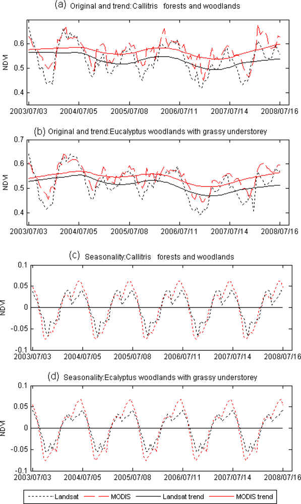The comparison of trend and seasonal components could be more useful than the comparison of the original series as they signify whether the NDVI time series generated from the LITS are showing similar pattern of vegetation change as shown by MODIS time series. The visual comparison of time series plots reveals that there is a slight difference between trends and seasonal components of the LITS and MODIS NDVI time series. A Mann-Kendall test, however, showed no significant difference between the trends of MODIS and Landsat TM time series for both vegetation communities. The test showed that the trends were slightly negative in all cases but none of them were significant at α = 0.05 (τ = −0.094, two sided p = 0.13 for Landsat TM time series and τ = −0.05, two sided p = 0.37 for MODIS time series of Callitris forests and woodlands and τ = −0.097, two sided p = 0.12 for Landsat TM time series and τ = −0.08, two sided p = 0.17 for MODIS time series of Eucalyptus woodlands with grassy understorey).