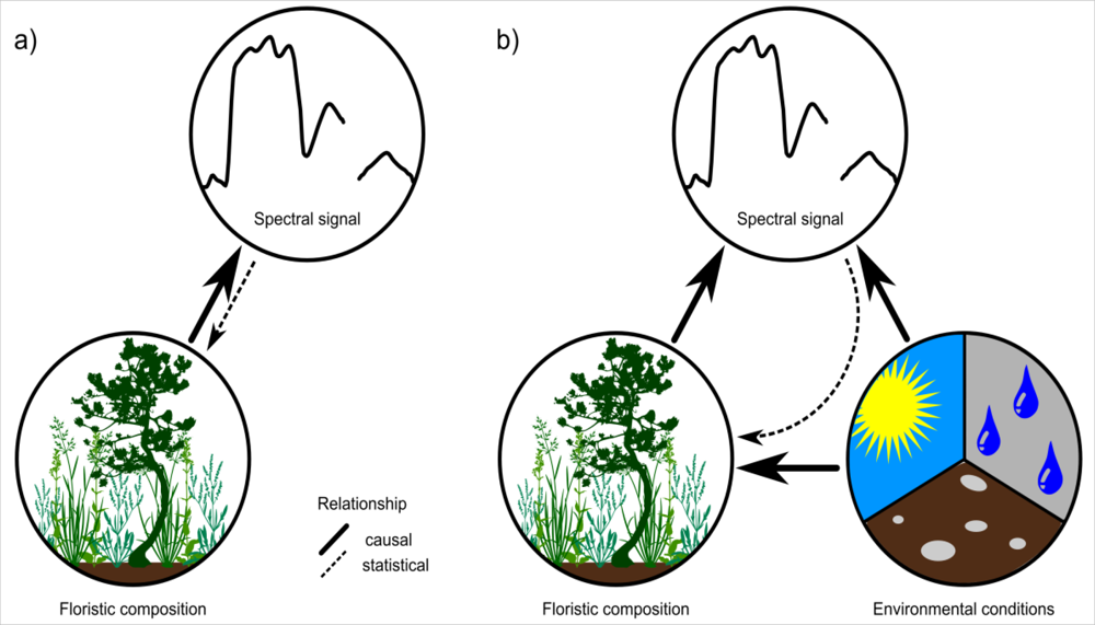 Remote-sensing approaches for mapping individual species or plant assemblages frequently rely on the biochemistry of the target species/assemblage [1–3]. Together with biophysical properties, plant biochemistry is directly responsible for the spectral signature of vegetation. For vegetation mapping, this relationship is inverted and the spectral signal is used to draw conclusions of the presence of a species or assemblage (see Figure 1(a)). A unique biochemistry of species along with phenological and structural characteristics may enable a discrimination of vegetation, but is inevitable for a reliable mapping result. Problems may arise if different species feature a similar spectral response, which is a common phenomenon in remote sensing [4,5]. A unique biochemistry and spectral signal is considered neither in the biological definition of a species, nor in the ecological classification of plant assemblages [6]. Further, species-specific biochemistry and spectral signal show a large spatio-temporal variation due to site conditions and other external influences [4]. This hampers a direct inversion of the relationship towards a quantification of the floristic composition and makes the direct mapping or classification of vegetation with remote-sensing approaches very challenging. However, mapping and modeling species distribution using remote sensors is still desirable. In particular at global and regional scales, where ground-based mapping is inefficient, remote sensing may be a practical alternative approach for vegetation mapping.