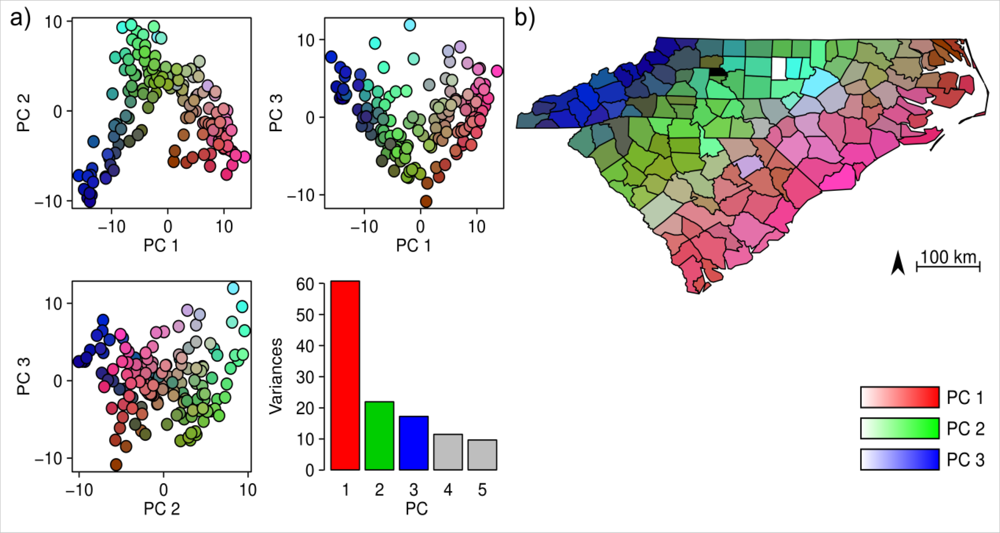Results of the PCA on the floristic data of North Carolina and South Carolina. (a) distribution of the counties in the floristic PCA space and the variances explained by the PCs, and (b) spatial distribution of PC-scores across these two states.
