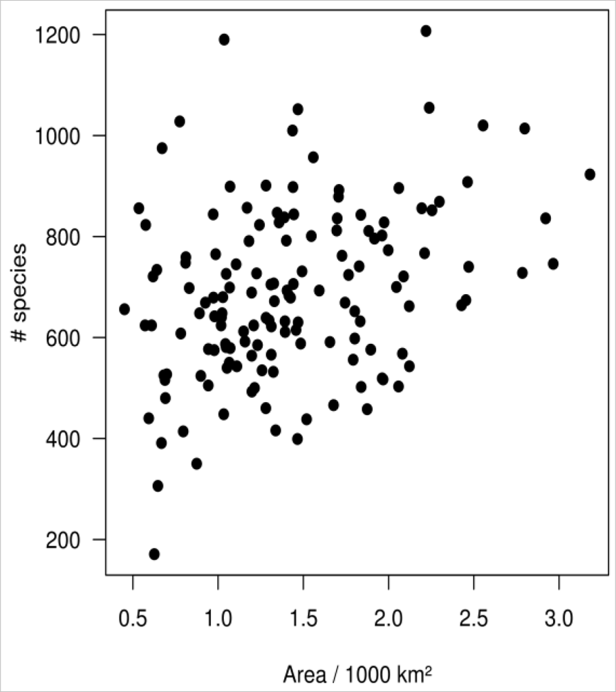 Relationship between county area and number of species per county.