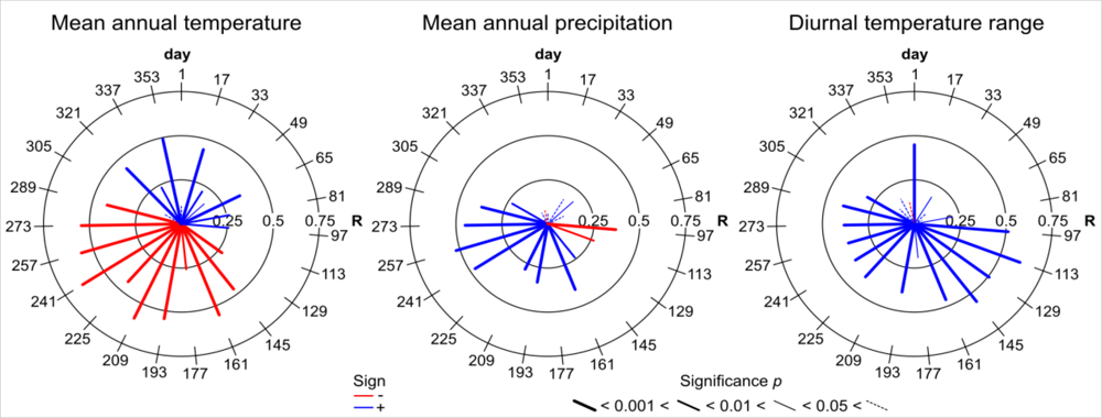 The PCA of the county-based bioclimate data revealed three strong climatic gradients (Figure 4(a)). The cumulative variance explained by the first three PCs was 50%. The analysis of the loadings showed that the main PCs represent a temperature gradient, a precipitation gradient, and a gradient from marine to continental climate. Three variables: mean annual temperature, annual precipitation, and mean diurnal temperature range were identified to represent these climatic gradients (Figure 4(c–e)).