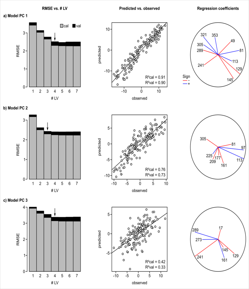 Results of PLS regressions between floristic gradients (PC1-3) and NDVI time series. Bar plots show the RMSE in model calibration and validation for models based on increasing numbers of LVs. Arrows in the RMSE-plots indicate the number of LVs considered in the final model. Scatterplots illustrate the relationship between actual (i.e., observed) PC scores and the model predictions. The influence of different dates throughout the year in the models is indicated by the regression coefficients. Numbers in these plots correspond to the Julian day of the respective NDVI time series.