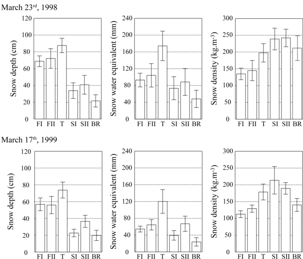 The snow water equivalent measurements reveal the actual amount of snow that accumulated. Between the two winters, we observed a difference of 20–25 mm water equivalent at BR, SI, SII, and FI and as much as 40–50 mm at FII and T. At BR, where the snow depth remained unchanged, there was actually twice as much snow in March 1998 as in March 1999. The greater amount of snow on the ground in 1998 introduced additional snow compaction, which translated into the higher snow density values. This is particularly true for the BR observation site, where the snow density was 210 kg·m−3 (1998) versus 140 kg·m−3 (1999).